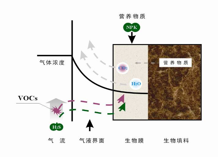 由於微生物將廢氣中的有害物質進(jìn)行(háng)轉化的過(guò)程在氣相中難以進行,所以廢(fèi)氣中(zhōng)氣 態汙染物首先要經(jīng)氣相轉移到液相或固體表麵的液膜(mó)中(zhōng)的傳質過程,然後汙染物才在液 相或固體表麵被微生物吸附降解(jiě)。